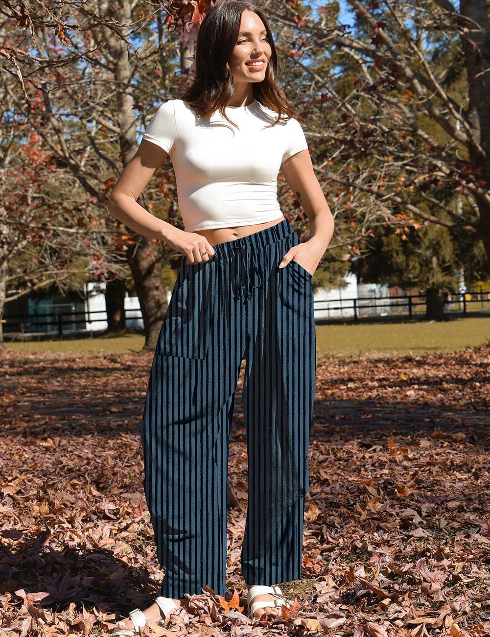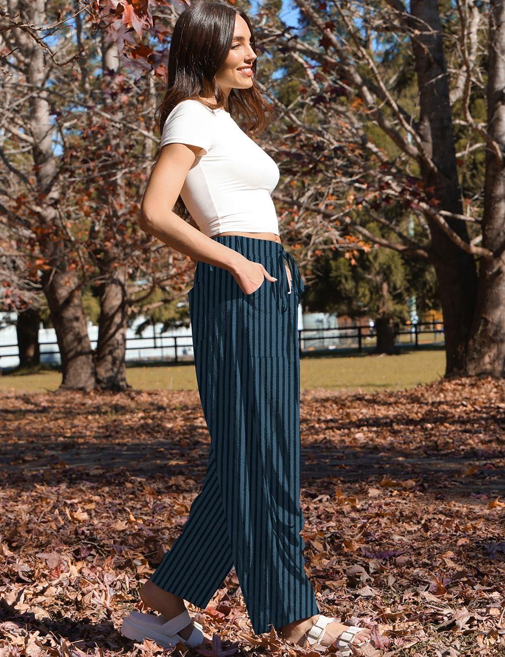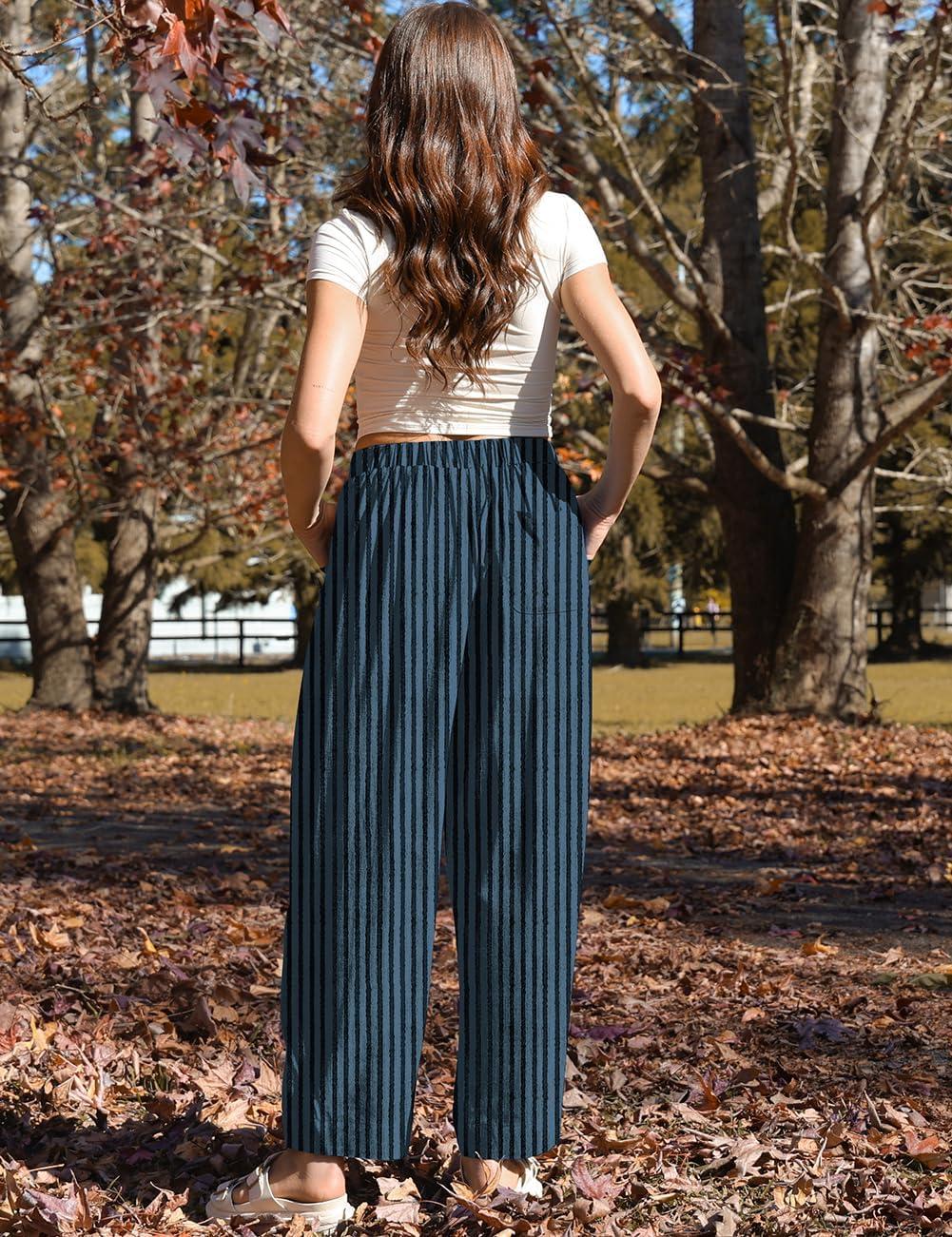 TARSE Women Linen Baggy Harem Pants Summer Drawstring Casual Lounge Pant 2024 Beach Travel Vacation Clothes with Pockets(Blackblue Striped)
