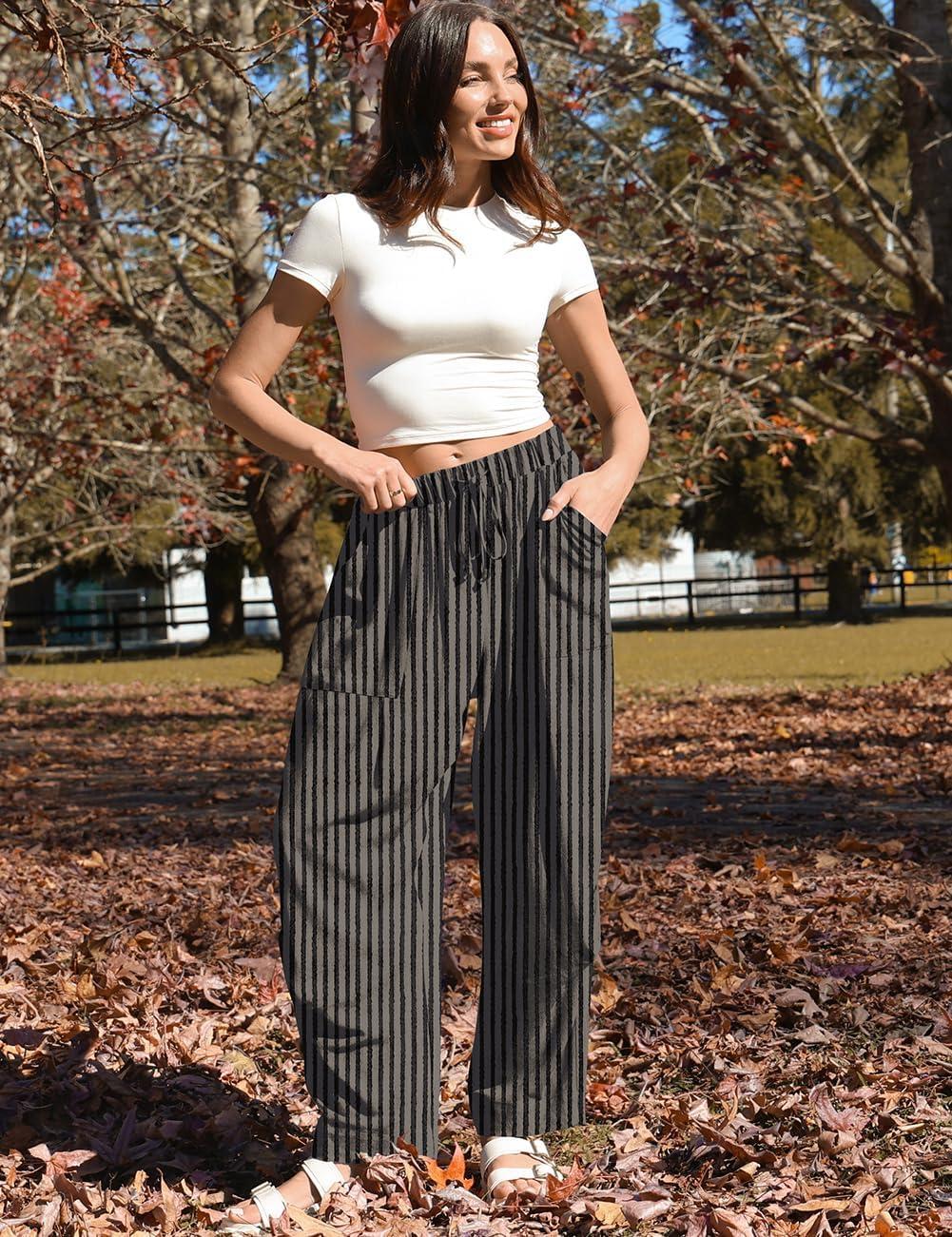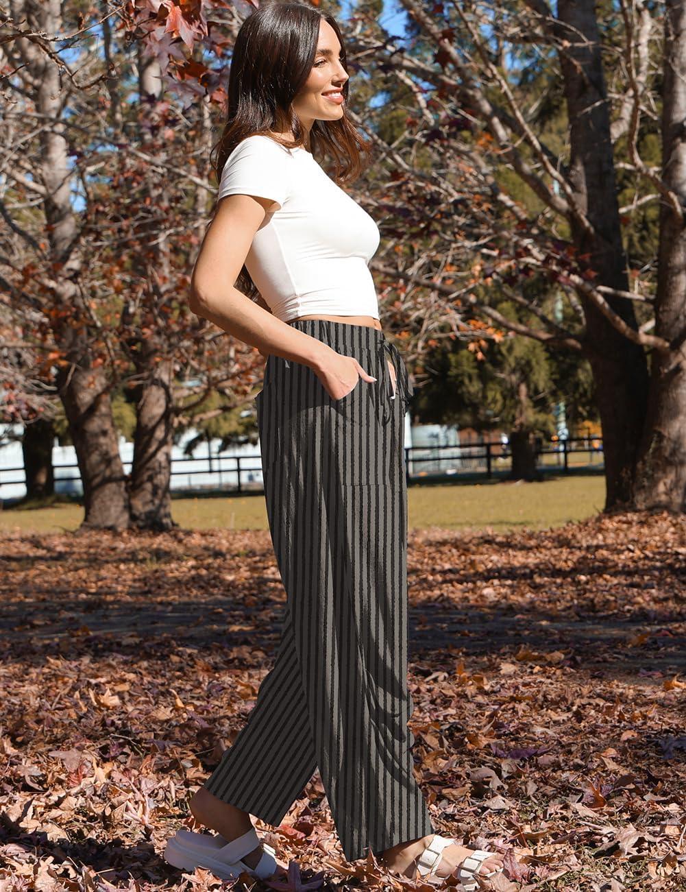 TARSE Women Linen Baggy Harem Pants Summer Drawstring Casual Lounge Pant 2024 Beach Travel Vacation Clothes with Pockets(Blackkhaki Striped)