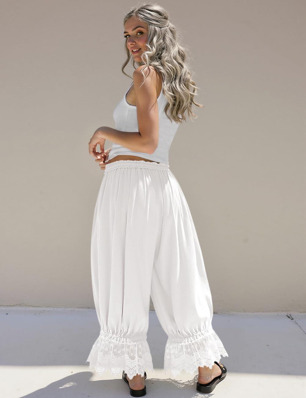 TARSE Women Linen Lace Trim Long Bloomers Pants Ruffle Victorian Vintage Pantaloons Summer Beach Travel Vacation Pants(White)