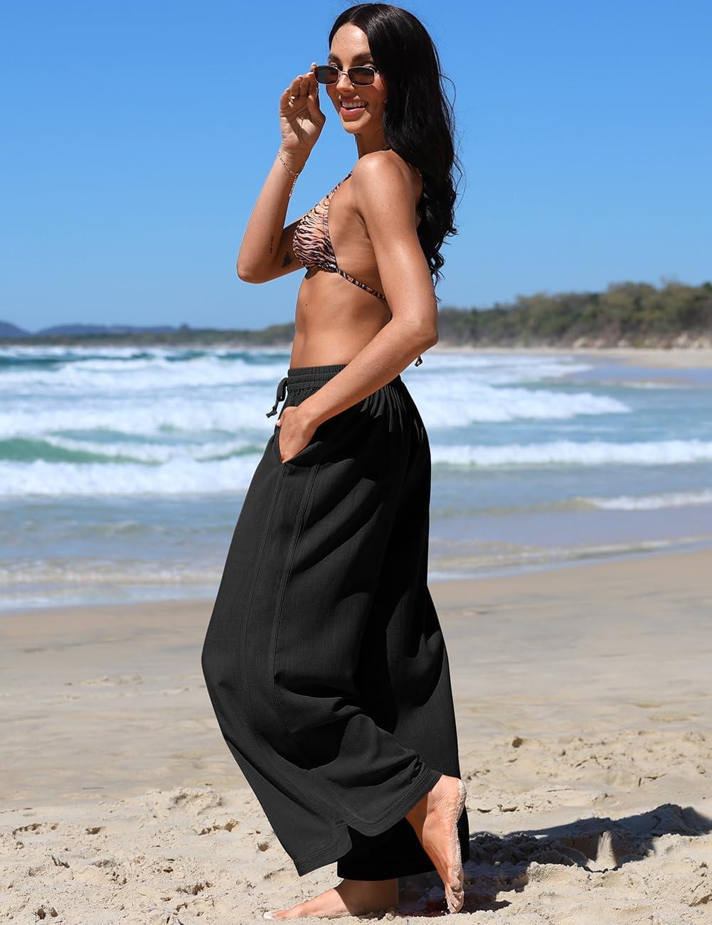 TARSE Women Linen Wide Leg Pants Casual Loose Drawstring Summer Beach Travel Vacation Palazzo Pants with Pockets(Black)