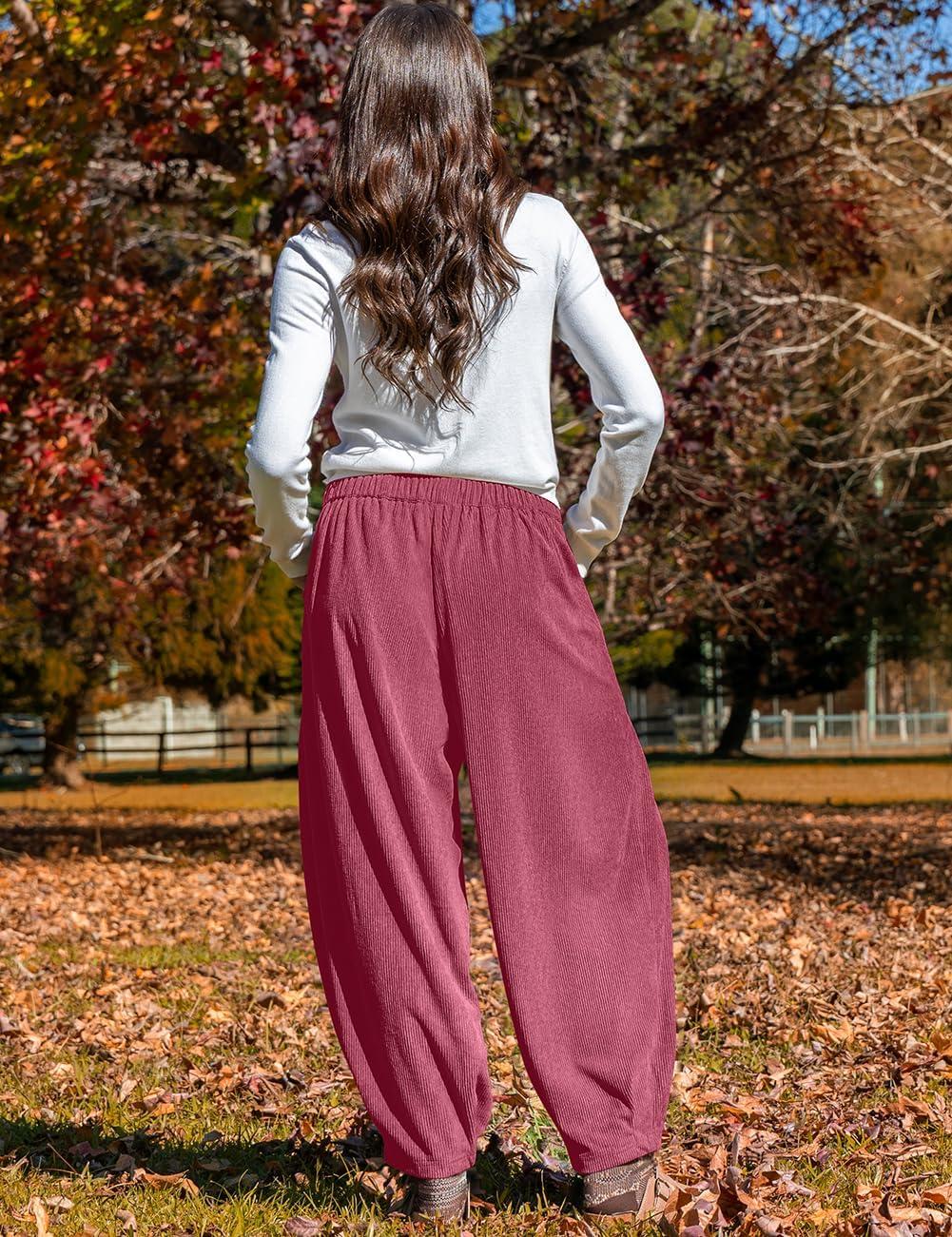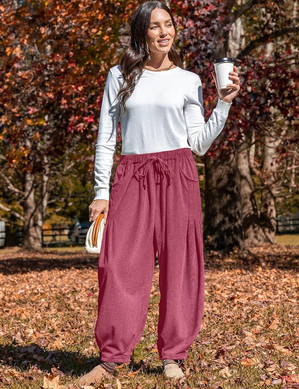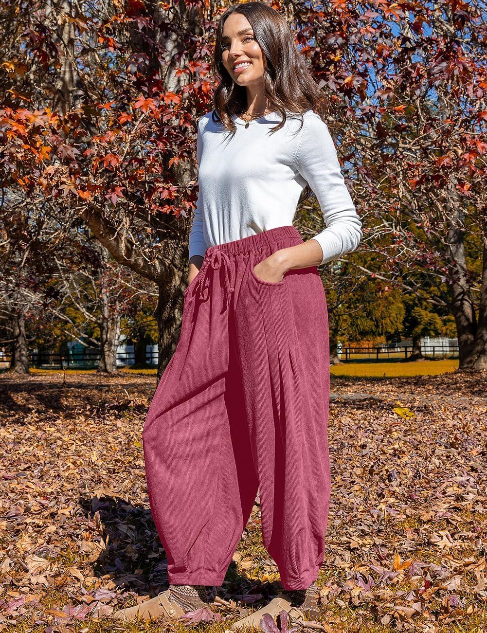 TARSE Womens Baggy Wide Leg Pants Corduroy Casual Drawstring Waist Palazzo Harem Pants with Pockets(Magenta)