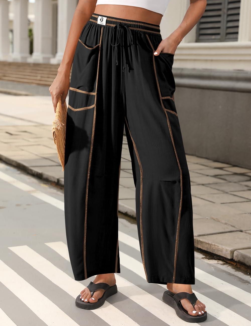 TARSE Womens Barrel Linen Pants High Waisted Harem Casual Loose Fit Wide Leg Baggy Drawstring Pants with Pockets(Black)