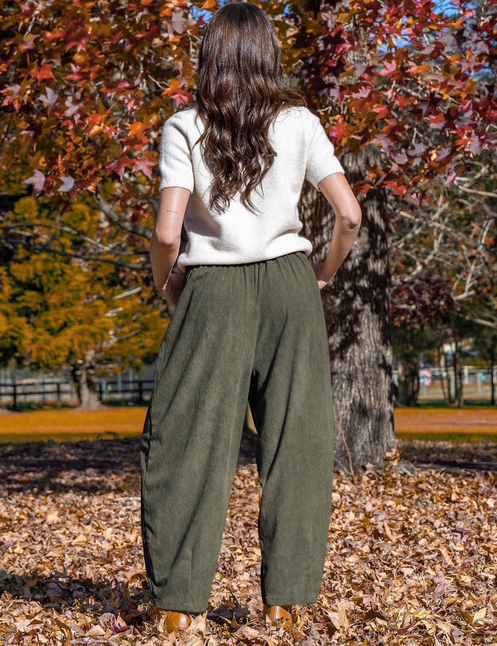 TARSE Women’s Corduroy Pants Baggy Wide Leg Pants Casual Elastic Waisted Palazzo Harem Pants with Pockets(Army Green)