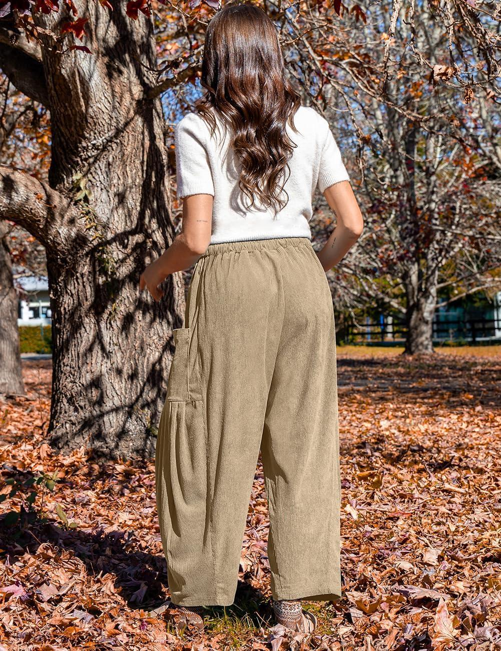 TARSE Womens Corduroy Pants Barrel Casual Loose Baggy Drawstring Wide Leg Palazzo Harem Pants with Pockets(Khaki)