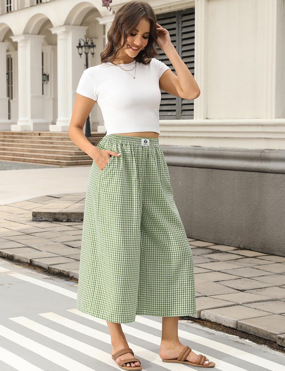 TARSE Womens Gingham Wide Leg Linen Capri Pants Casual Loose Plaid Culottes Elastic Waist Palazzo Pants with Pockets(Green White Plaid)