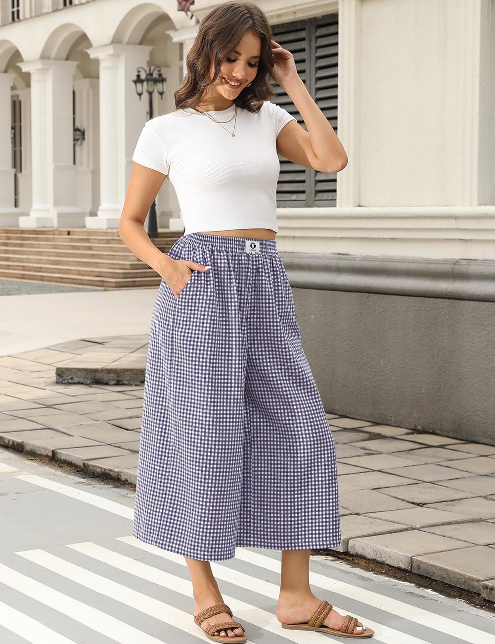 TARSE Womens Gingham Wide Leg Linen Capri Pants Casual Loose Plaid Culottes Elastic Waist Palazzo Pants with Pockets(Purple White Plaid)
