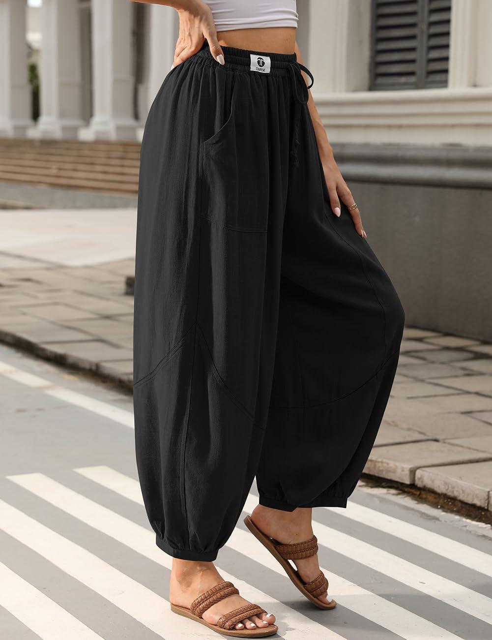 TARSE Womens Linen Barrel Harem Pants Casual Wide Leg Baggy Drawstring Boho Summer Beach Palazzo Travel Pants(Black)