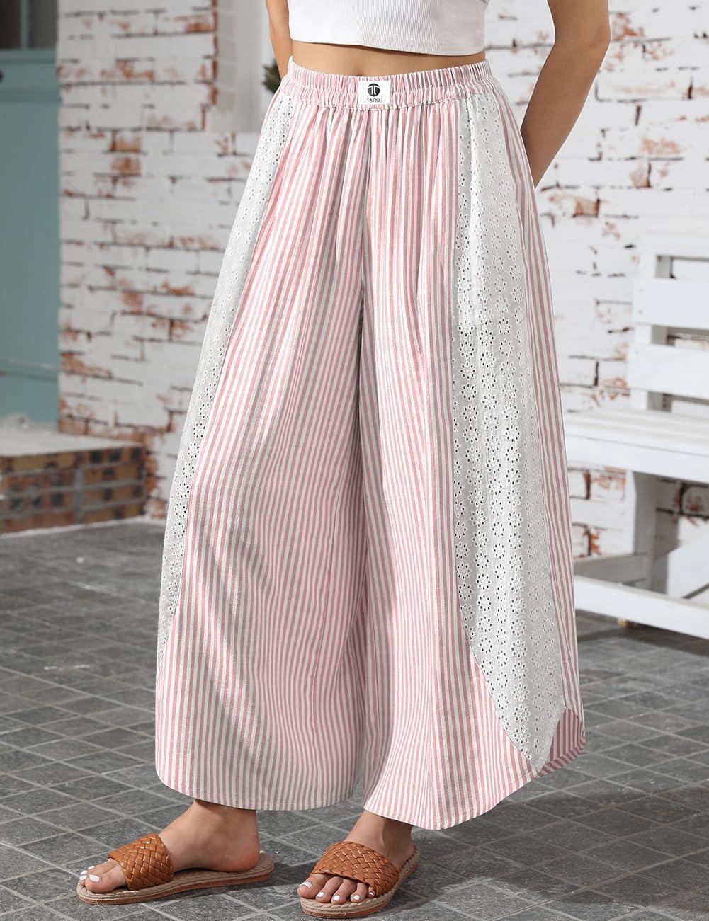 TARSE Womens Wide Leg Striped Boho Palazzo Pants with Lace Panel Summer Loose Elastic Waist Beach Vacation Lounge Pants(Red White Striped)